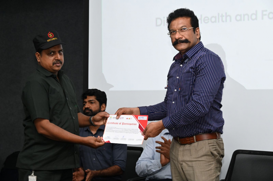 Certificates of participation were symbolically presented to Mrs. Jayanthi Shetty and Mr. Naseer Kukkaje for successfully completing the CPR training session. The event proceedings were emceed by Ms. Sushmitha P.B., and was attended by Heads of Departments, Section Heads, Consultants, Yen Mithras, and other staff members. The program concluded with a vote of thanks by Dr. Mukhtar Abdullah, Assistant Medical Superintendent, YMCH.